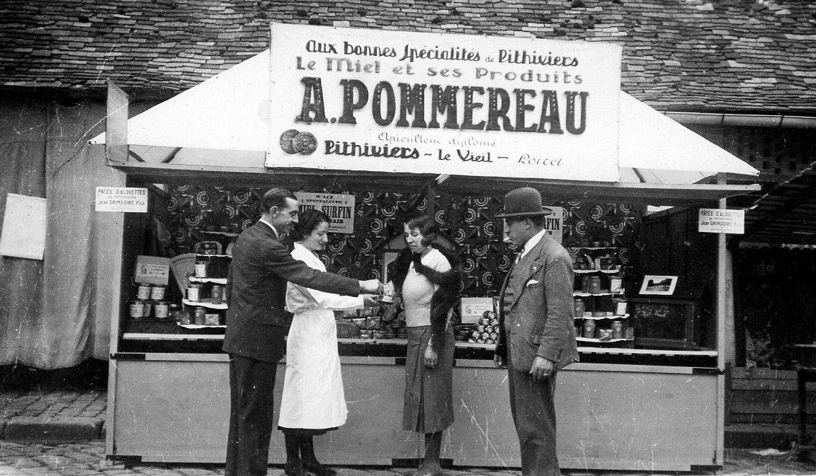 Odette et André vendaient une grande partie de leur production sur les marchés régionaux comme ci-dessous au marché d'Arpajon en 1933. Le reste était vendu à la coopérative de Pithiviers ou chez des dépositaires comme les cousins Pierre(*) et Suzanne, boulangers à Paris, rue du Cherche-Midi.