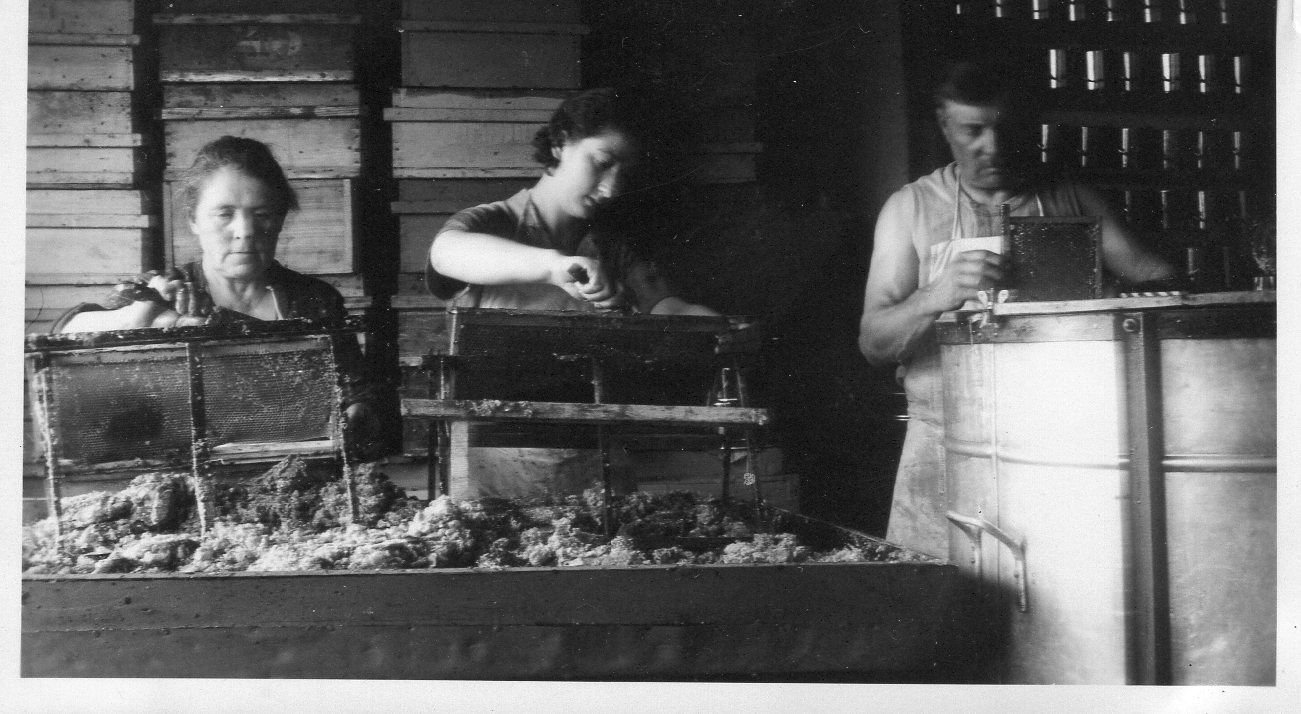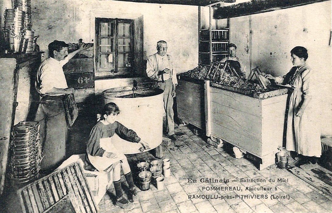 Sur cette carte postale on peut remarquer Louis-Isidore (au centre), Jules son fils (à gauche), Marie sa belle fille (à droite) et deux des enfants de Jules, André (au fond à droite) et Yvonne assise devant l'extracteur. La photo a été prise dans la miellerie de Jules qui était installée dans sa maison (aujourd'hui 25, rue d'Auvergne à Ramoulu).