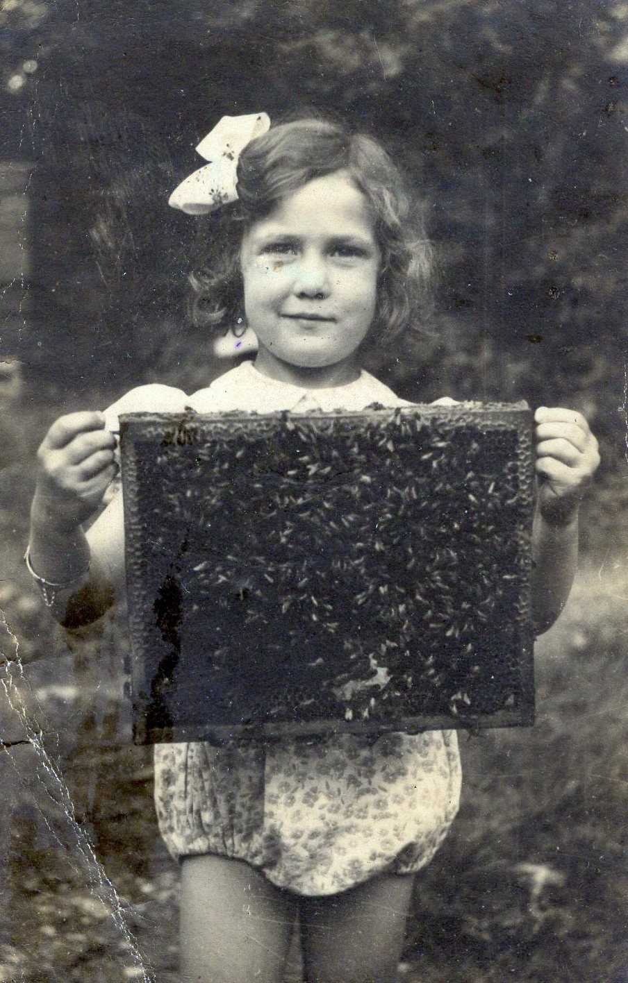 Contrairement à ce que pourrait laisser à penser cette photo, Odette et André n'étaient pas des parents indignes ! Monique, une de leurs filles, du haut de ses cinq ans, ne semble pas impressionnée par le cadre rempli d'abeilles !