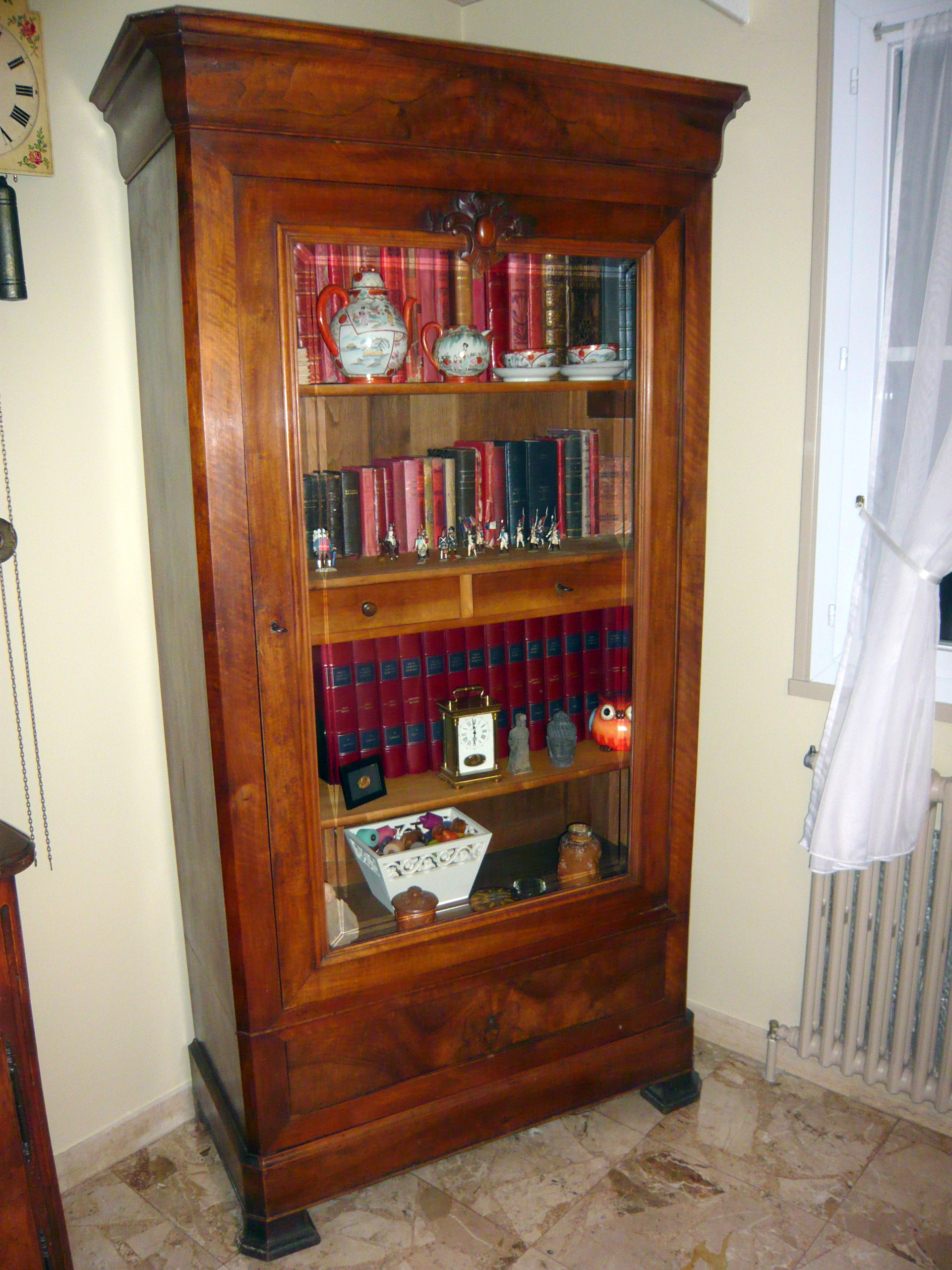 Cette armoire, de style Louis-Philippe, était à l'origine dotée d'une glace. Elle était destinée à entreposer le linge de famille, et elle a accompagné Henriette et Ferdinand tout au long de leur vie. Par la suite, le tain de la glace a été enlevé pour transformer cette dernière en bibliothèque. Lors du démontage du panneau situé derrière la glace, Nous avons remarqué des inscriptions faites au crayon sur les montants du panneau. « Picard Jules» «Beaumont du Gâtinais Seine et Marne le 19 mars 1914» «Juliette Picard». Il est vraisemblable que Henriette, fille de Jules Picard, ait hérité de ce meuble, lors du décès de ses parents…(la suite)