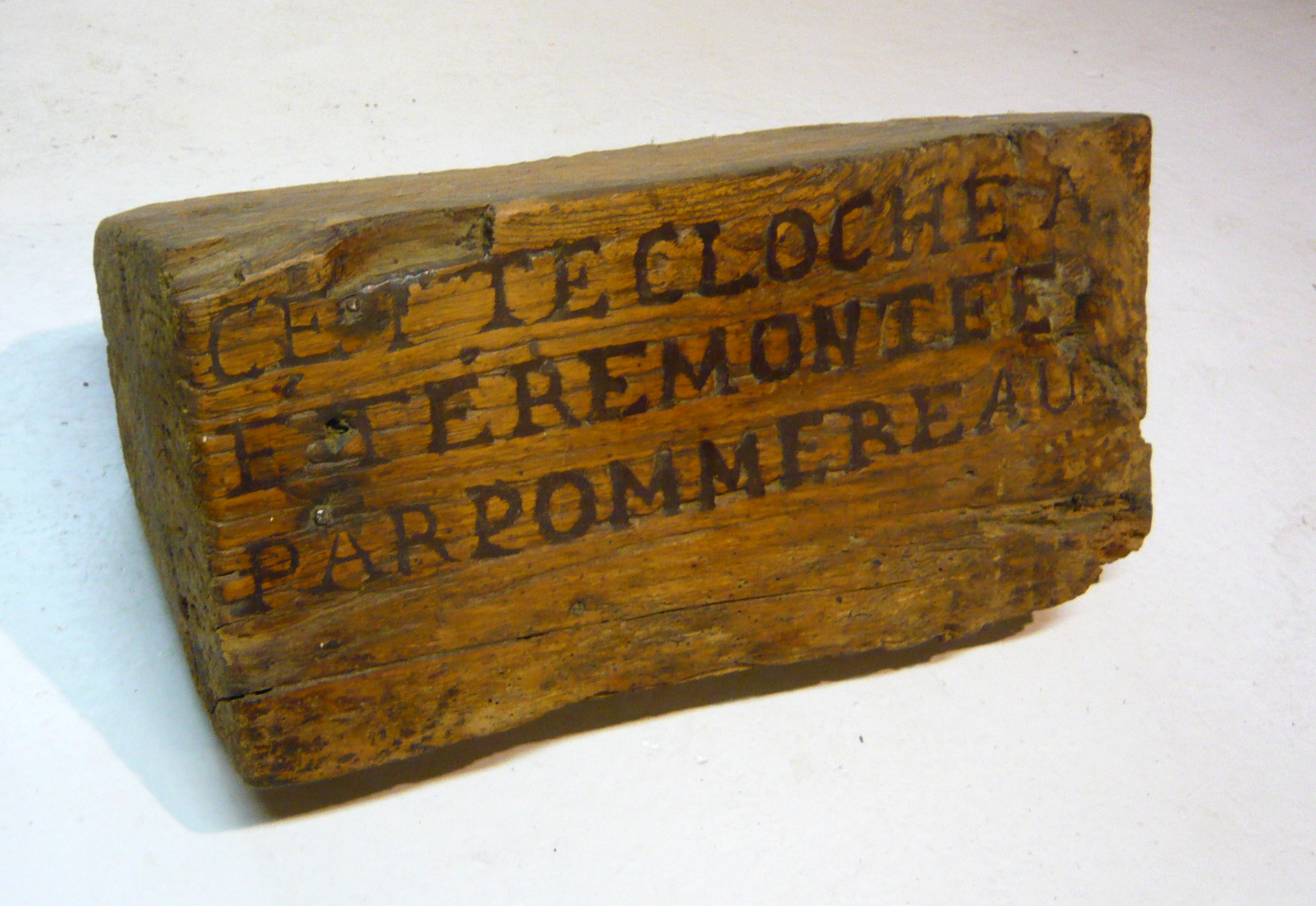Il y a une soixantaine d'années, Michel découvrait dans un tas de bois destiné à être brûlé, une pièce de chêne paraissant avoir été travaillée et sur laquelle on devinait difficilement le nom de Pommereau. Surpris, il écarta ce morceau de bois et entreprit de le nettoyer. Après une petite restauration, il vit nettement apparaître l'inscription « Cette cloche a été remontée par Pommereau »… (la suite)