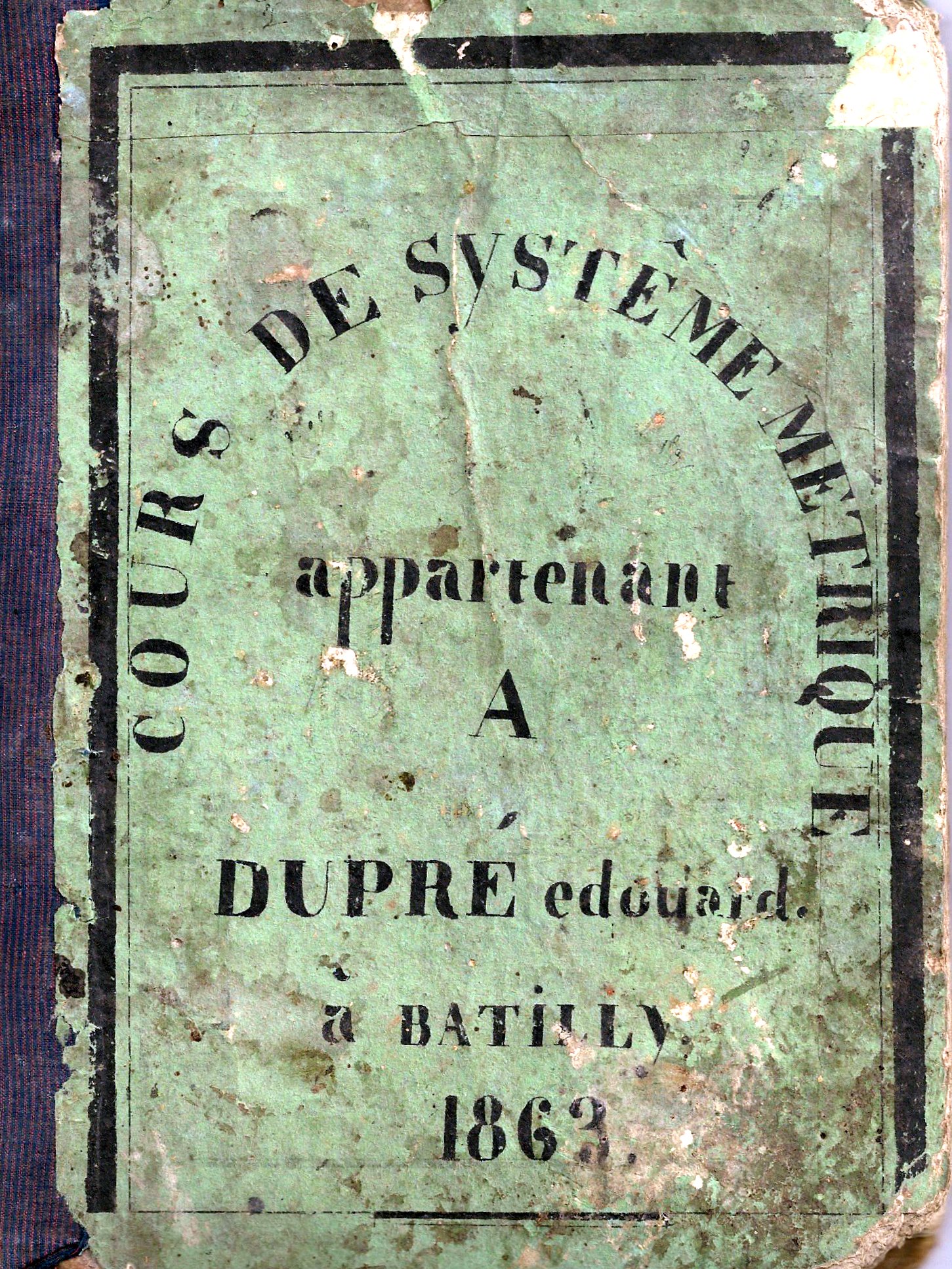 De Henriette Pommereau (née Picard), nous avons « hérité » d'un manuel de couleur verte portant la mention sur une couverture cartonnée « Cours de système métrique appartenant à Dupré Edouard, à Batilly 1863 ». Henriette était de par sa mère en famille directe avec la famille Dupré de Batilly (Loiret).