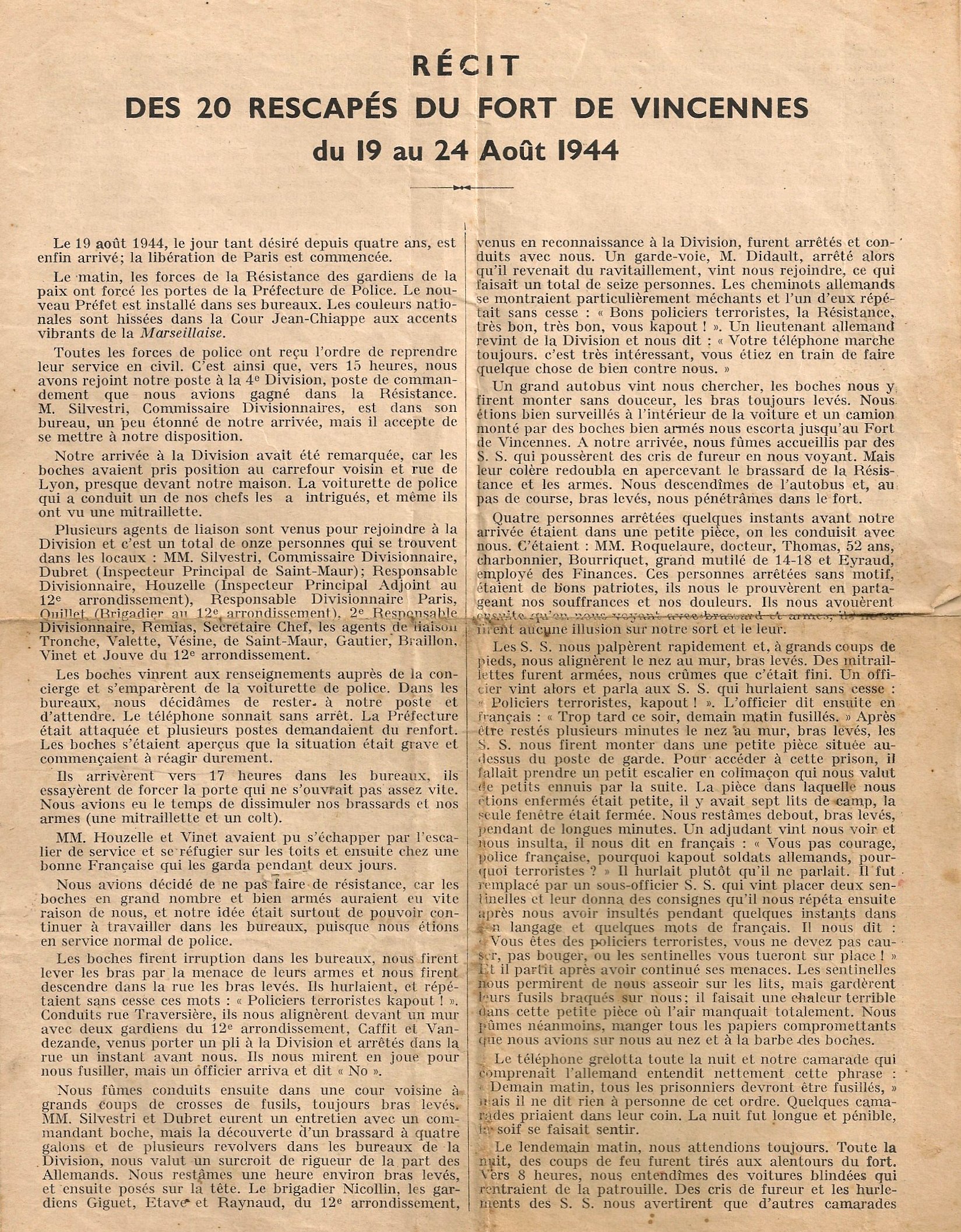 D'une part, un voisin et ami, gardien de la Paix au 11ème arrondissement, Lucien Pillias, a remis à notre famille peu après la libération, un feuillet imprimé de 4 pages sur lequel est consigné, par les survivants, le récit des horreurs qu'ils ont eu à subir durant ces 6 jours. Ce sont ces pages qui sont reproduites ici. Ce document a été rédigé dans un temps très proche de Libération et sa lecture est particulièrement poignante. La dernière page supporte en bas, les traces d'un tampon encreur mentionnant “12ème arrondissement”.