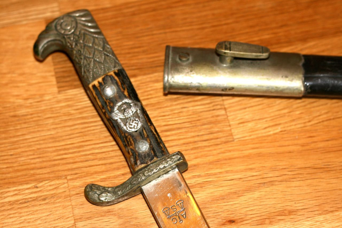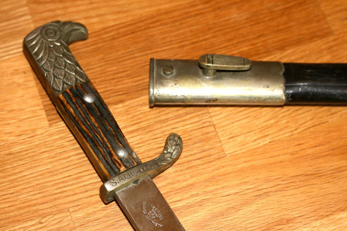 En fait, il s'agit d'une baïonnette de tenue de sortie qui était en dotation dans la police allemande. Celle-ci, dont la lame est d'une longueur de 33cm, a été fabriquée par les ateliers Alexander Coppel de Solingen. Sur le quillon en métal chromé se trouve les marques suivantes : S.Ar III. suivies du numéro d'ordre 180.Les mêmes références se trouvent sur le fourreau. Le pommeau est à tête d'aigle ciselée et une croix gammée figure sur l'une des plaquettes.