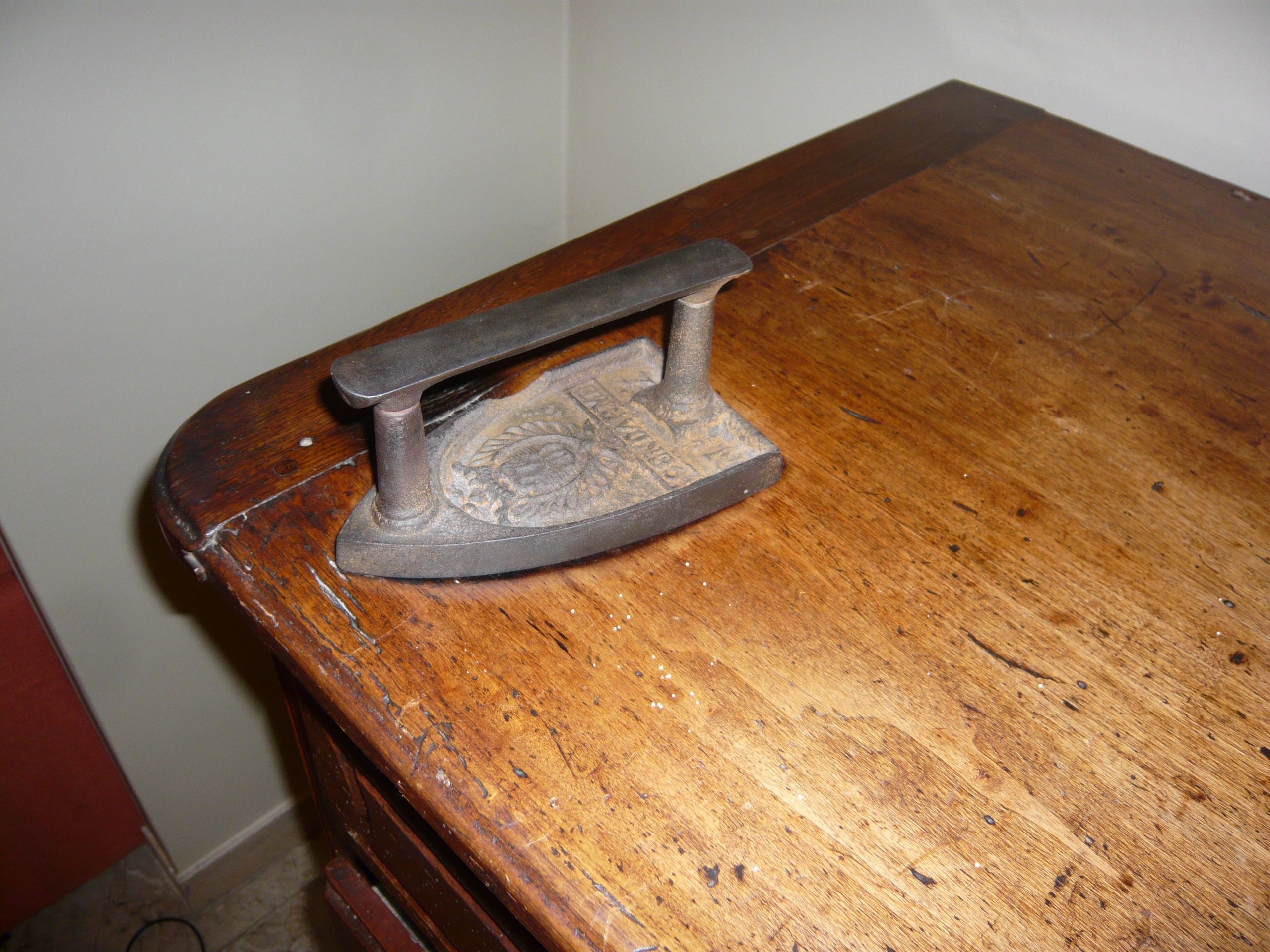 C'est ainsi que ce buffet s'est retrouvé dans l'arrière boutique de la boulangerie de Fontenay Sous Bois où, faute de place, il a également rempli un deuxième rôle, celui de «planche à repasser». A cette époque, la tâche du repassage était dévolue à une voisine qui exerçait également la fonction de vendeuse. Or donc, en plein repassage, cette dernière est allée servir une cliente. La conversation a certainement du s'éterniser jusqu'au moment où une odeur de bois brûlé a alerté les deux bavardes… C'est pourquoi, le plateau du buffet porte cette empreinte de fer à repasser que nous avons dissimulé en y installant….un fer à repasser !