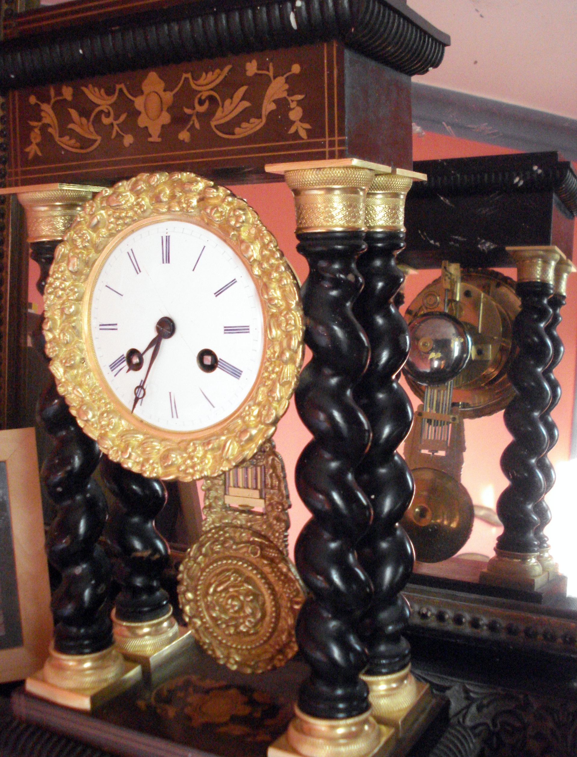 Il s'agit d'une pendule à colonnes, de l'époque Napoléon III. Elle possède quatre colonnes torses en bois noirci qui reposent sur un socle, et le chapiteau est composé de marqueterie en bois clair sur fond brun.