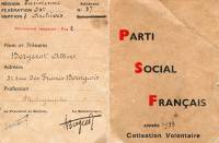 En fait, nous avons trouvé trace de son passage dans le Parti Social Français, avec sa carte d'adhérent, sa carte de contributeur, et son brassard supportant l'écusson des Volontaires Nationaux.