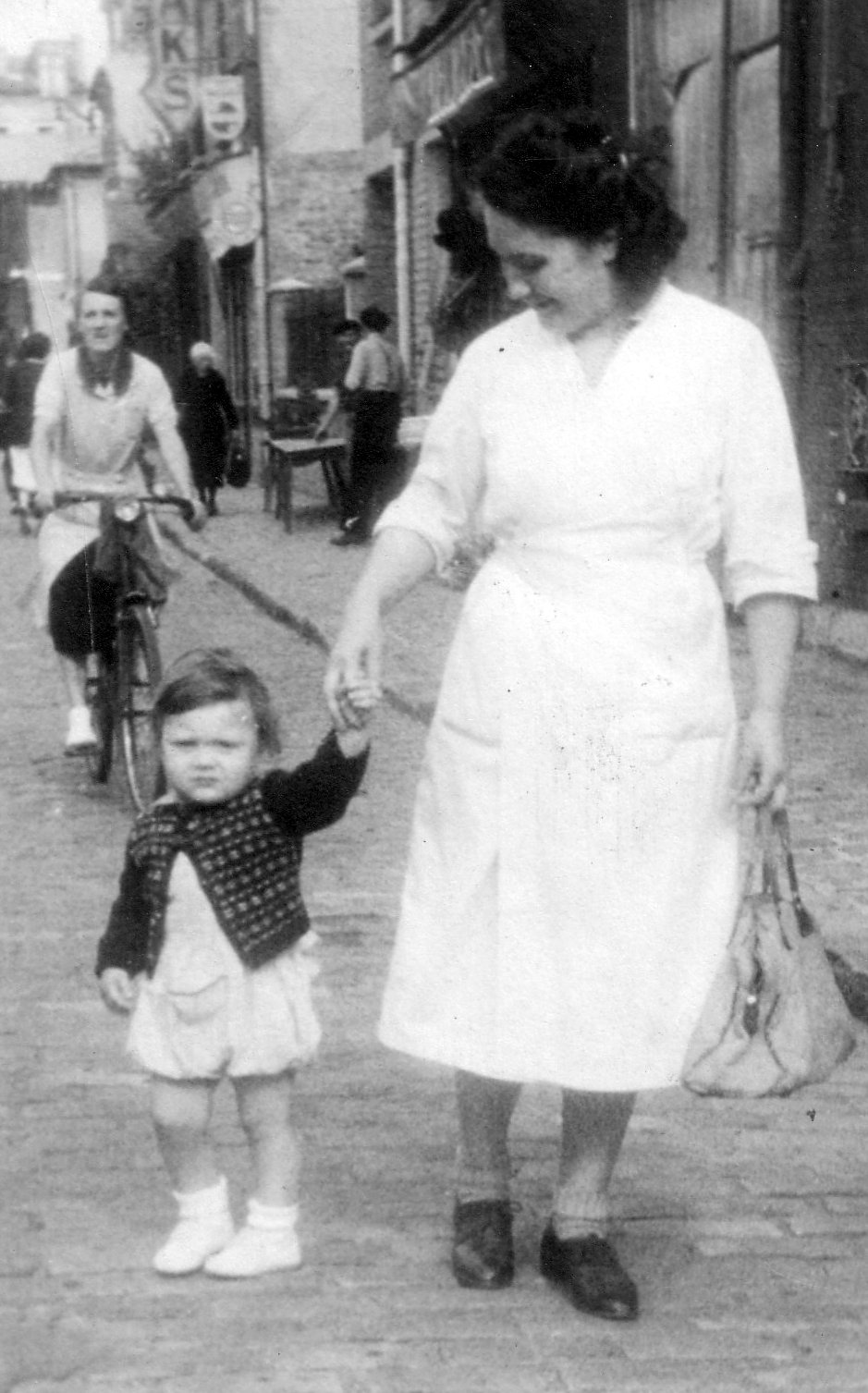 Suzanne profitait, de temps à autres, d'un moment de calme pour se rendre jusqu'au marché couvert de Fontenay. On remarquera que pour l'occasion, elle n'avait pas quitté sa blouse de boulangère (Ici, en 1948 avec Jean-Claude)