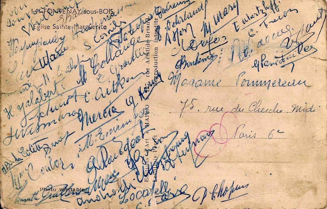 Au sein de la Paroisse Sainte Marguerite, Suzanne faisait partie d'un groupe de femmes chrétiennes appelé “La Ligue”. Lorsque la famille déménagea pour aller s'installer rue du Cherche Midi à Paris, elle reçu la carte ci-dessus signée de toutes ses amies de la Ligue. Nous avons pu identifier quelques noms de famille dont ceux de Mesdames : Videcoq, Vismara, Locatelli, Dupuy Dauby, Chopin, Guillemot, Hadjinassou, Mercier et Collange…..