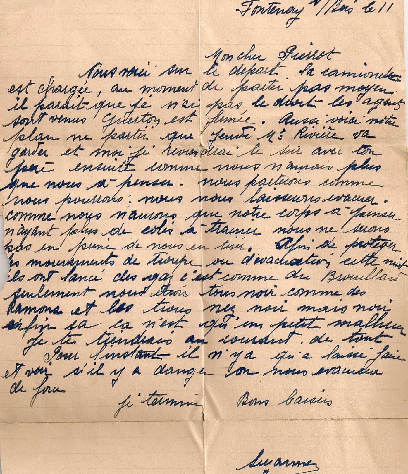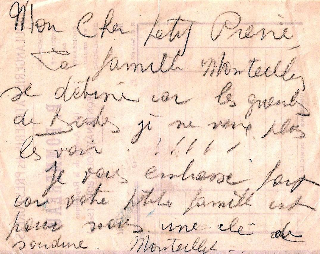 A peine s'étaient ils fait à leur nouvelle vie que la guerre est intervenue en 1939. Pierre a du répondre à l'appel de mobilisation et partir. Il ne reviendra à Fontenay que le 1er mai 1945, après un an de guerre et cinq années de captivité. (voir “Pierre guerre et drôle de guerre”) Des voisins et amis, la famille Monteillet, avaient quant à eux préféré “se débiner” plutôt que de voir les “gueules de Boches”. ils ont glissé cet amical petit mot dans un courrier que Maman destinait à Papa…