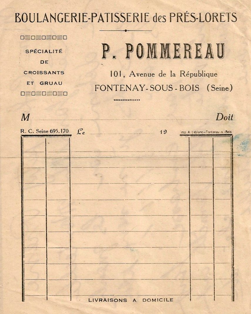 Pierre et Suzanne se sont installés à Fontenay Sous Bois en 1937. Ils ont repris la boulangerie pâtisserie qui se trouvait au 101 avenue de la République. La boutique se prolongeait par une pièce à vivre et le fournil. En montant au premier étage où se trouvait une chambre, on accédait à un jardin étroit et tout en longueur, puis au garage donnant dans la rue des Prés-Lorets. Dans un même temps, Henriette et Ferdinand se sont installés, tout à coté, dans un pavillon Villa des Prés-Lorets. Ils hébergeront chez eux leurs petits enfants, Michel et Jean-Claude.