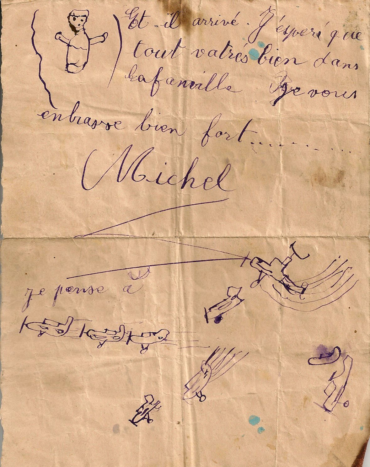 Sur ce dernier courrier ci-dessus Michel s'inquiète de savoir si “Il est arrivé”… On remarquera que déjà, il était passionné d'avions et de combats aériens.