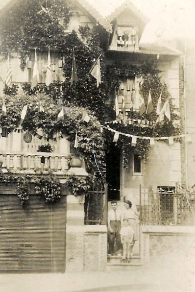 Ces deux clichés ont été pris dans la semaine du 8 mai 1945. A gauche Pierre est de corvée de balai. Sur la photo de droite, Pierre, Suzanne et Michel devant la maison des Leconte pavoisée comme toutes les autres maisons des alentours.