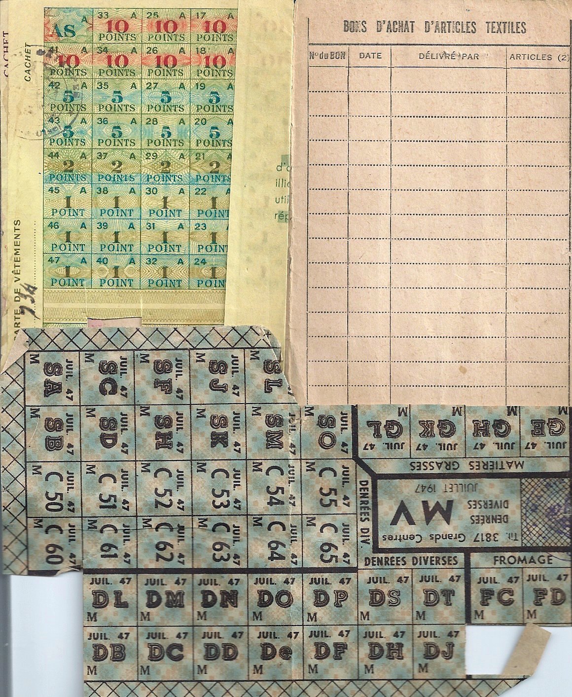 Durant ces cinq années, Suzanne a mené de front une vie de mère, de femme dont le mari est prisonnier, de commerçante avec tous les impératifs de gestion d'autant plus difficiles que l’approvisionnement était aléatoire. Sans compter, bien entendu, la réalisation et la vente du pain et des viennoiseries…Il fallait également comptabiliser et vérifier les tickets de rationnement. Ces derniers seront utilisés encore après la guerre, comme ceux ci-dessous.