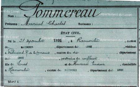 Marius, Charles est le benjamin des quatre frères Pommereau. Il est né le 21 septembre 1891 à Ramoulu. De nature fragile, il sera le chouchou de sa mère Eudoxie qui prendra un soin particulier de lui. En 1912, lors du conseil de révision à Malesherbes, il sera ajourné et classé dans le service auxiliaire en raison de sa santé précaire. A cette époque, Marius résidait à Pithiviers (rue de la Couronne) où il exerçait la profession de commis coiffeur. En 1913, il sera incorporé, au titre d’auxiliaire, à l'école de gymnastique de Joinville-le-Pont (aujourd'hui dans le Val de Marne) (*). Le 1er août 1914 survint la mobilisation générale suivie, deux jours plus tard, de la déclaration de guerre de l'Allemagne à la France.