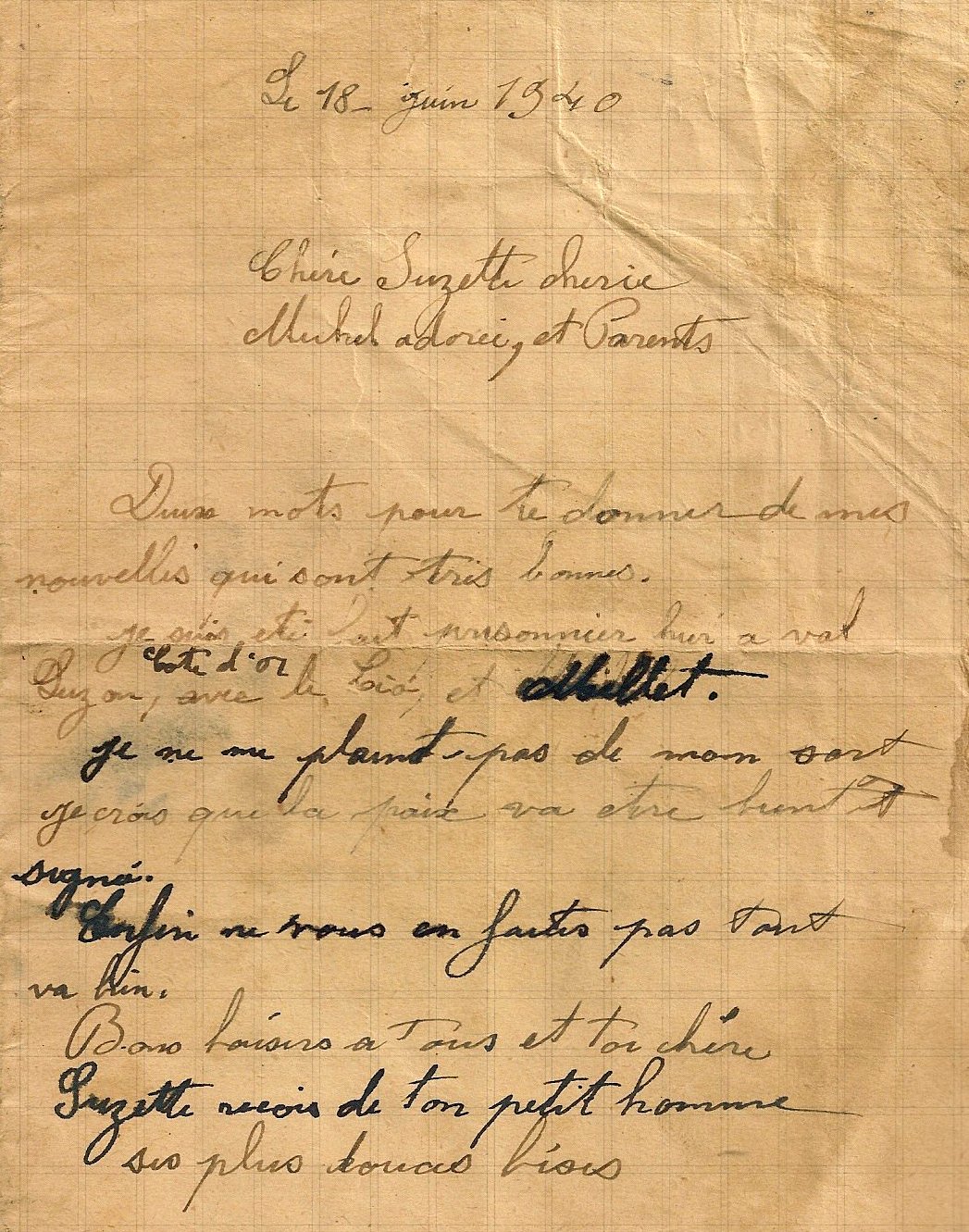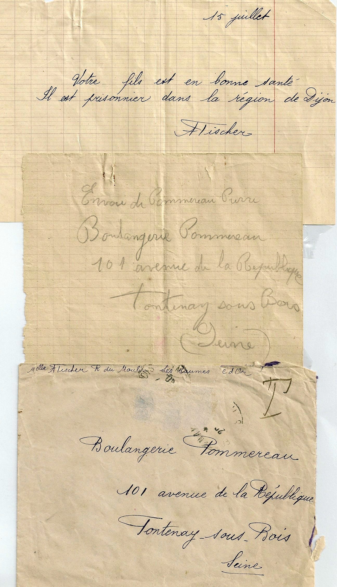 Un courrier posté par une personne charitable de Venarey les Laumes (Cote d'Or), a appris à Suzanne que son mari avait été capturé et était « en bonne santé » dans un camp de prisonniers du côté de Dijon. En fait il s'agissait du camp de Longvic. (Frontstalag 155).