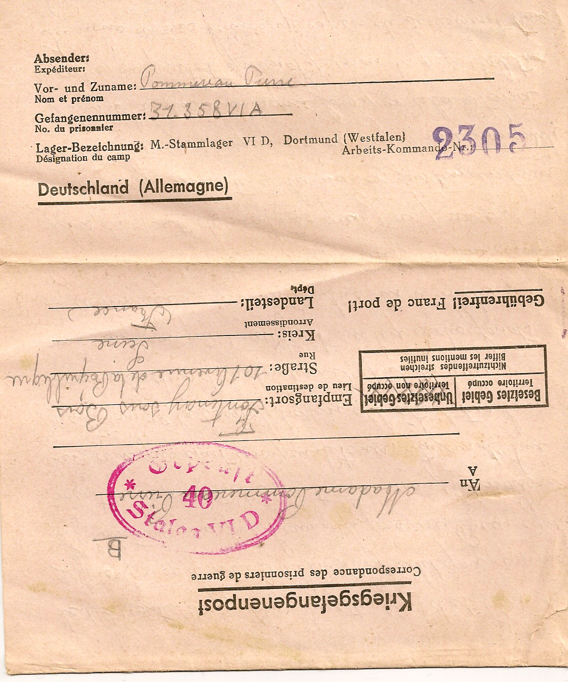 Pierre POMMEREAU est enregistré sous le numéro 31.358 comme l'indique le «Meldung» (Registre de recensement des prisonniers). Il est déclaré en bonne santé.