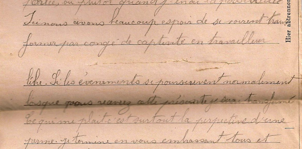 Le fait d'être «transformé» lui avait fait croire, ainsi qu'à un bon nombre de ses camarades, qu'une permission prochaine leur serait accordée, comme il l'écrit dans ce courrier daté du 1er août 1943. De fait, l'octroi d'un passeport laissait à penser qu'ils pourraient circuler librement, mais ce ne fut qu'un leurre……