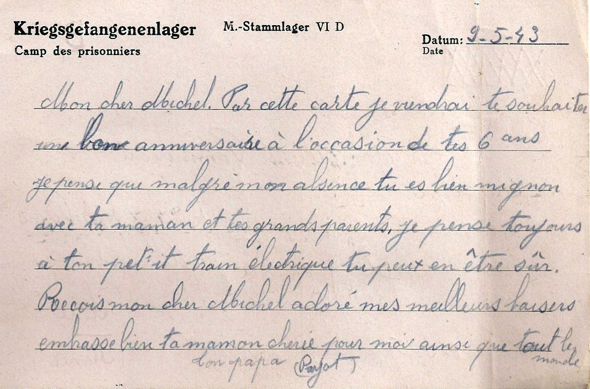 Malgré tout, Papa a réussi à faire parvenir à Michel un jouet pour Noël 1943. Le Jouet, sans doute réalisé par des prisonniers, est arrivé démonté. 70 ans après, Michel (6 ans à l'époque) conserve précieusement son cadeau de Noël. Il a également reçu au moins une carte de papa.
