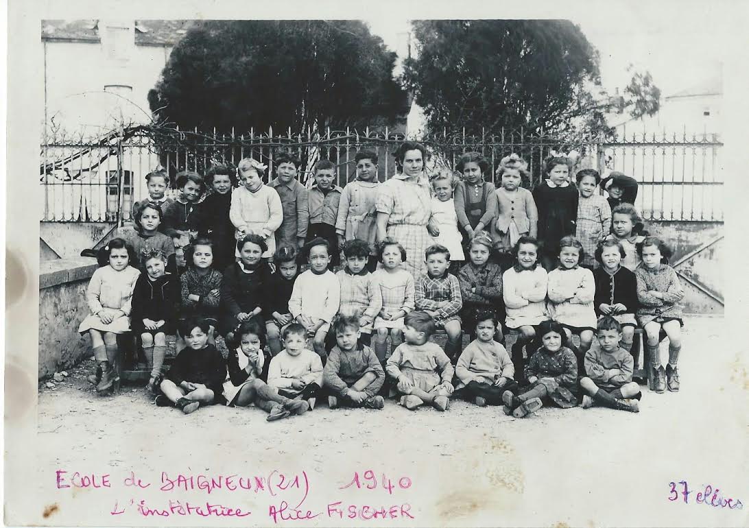 Ci dessous, une photo de Alice Fischer au milieu de ses élèves en 1940 à l'école de Baigneux (Cote d'Or). Cliché aimablement fourni par sa fille en 2014.