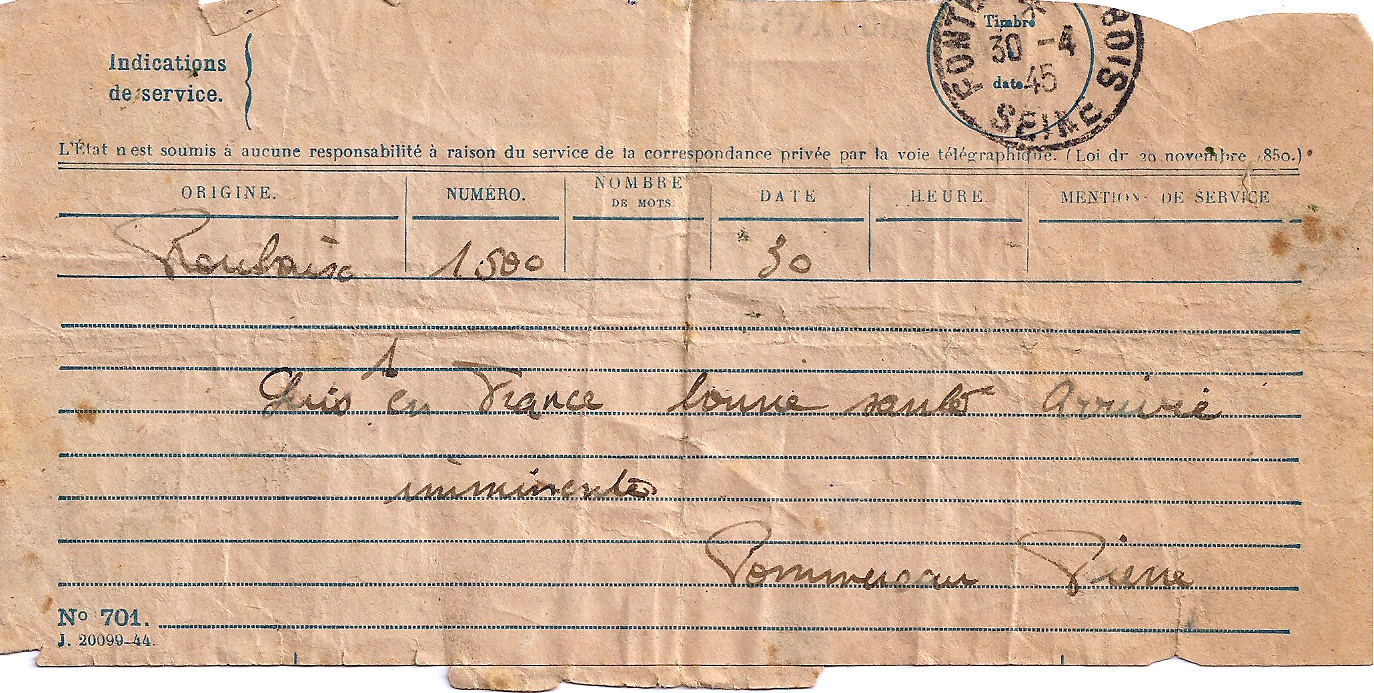 Le retour en France qui devait s'effectuer initialement en avion, s'est déroulé en camion puis en train à travers la Belgique. Papa est toujours resté étonné et admiratif du travail des cheminots belges épaulés par du matériel américain. Le train avançait au fur et à mesure de la réparation des voies. Le train a même traversé une ville entière en Belgique sur une voie provisoire. Pierre Pommereau, après être passé par l'hôtel Lutétia à Paris comme beaucoup de prisonniers, a retrouvé sa famille à Fontenay Sous Bois le 1er mai 1945. Et ce jour là, il neigeait ! Son arrivée avait été annoncée par un télégramme.(Photo ci-dessous) Au total, papa aura passé 5 ans en Allemagne et une année en temps que soldat durant la « drôle de guerre ».